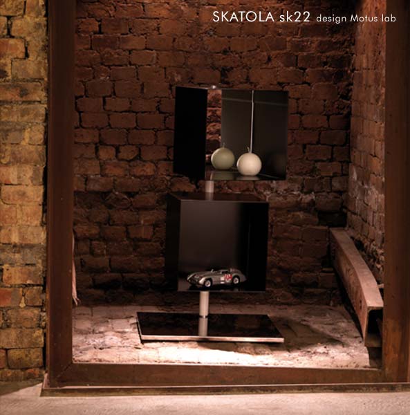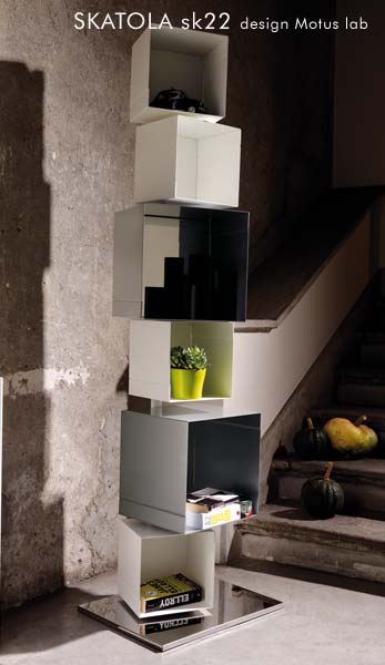 Evoluzione creativa di Skatola, vede l’impiego di uno o più elementi (nella forma quadrata in due varianti dimensionali) montati su una piantana dotata di base d’appoggio. Permette un’ampia flessibilità di orientamento degli elementi fissati (dritti o sfalsati) e la possibilità di mixare le due misure dell’elemento compositivo.